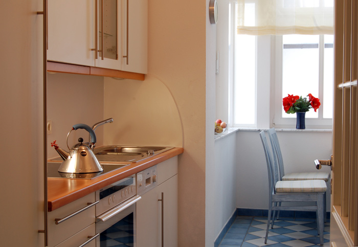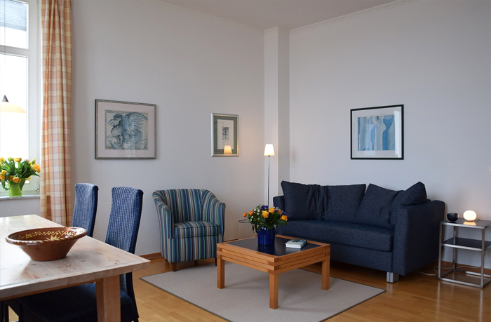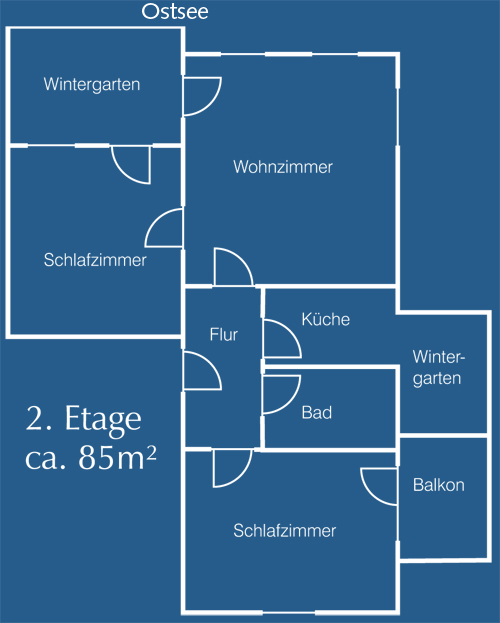 Die Wohnung ist ca.86 mē groß. Sie hat zwei Schlafzimmer, ein Wohnzimmer mit angrenzendem Wintergarten, eine separate Küche mit einem Essplatz in einem weiteren kleinen Wintergarten, ein Bad mit Dusche und Badewanne und einen kleinen Balkon. Die Küche ist mit Kühlschrank, Herd (Ceranfeld und Backofen), Spülmaschine und Mikrowelle ausgestattet.
